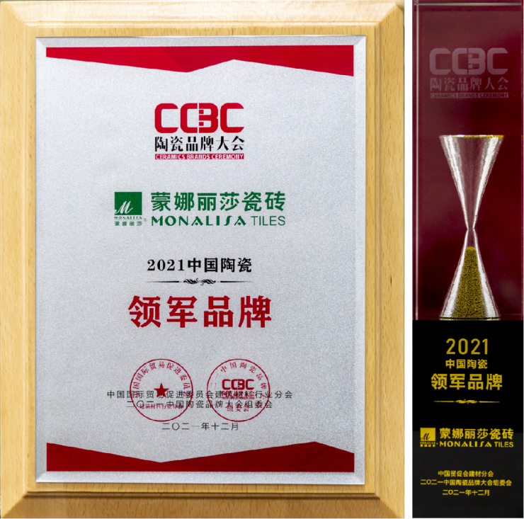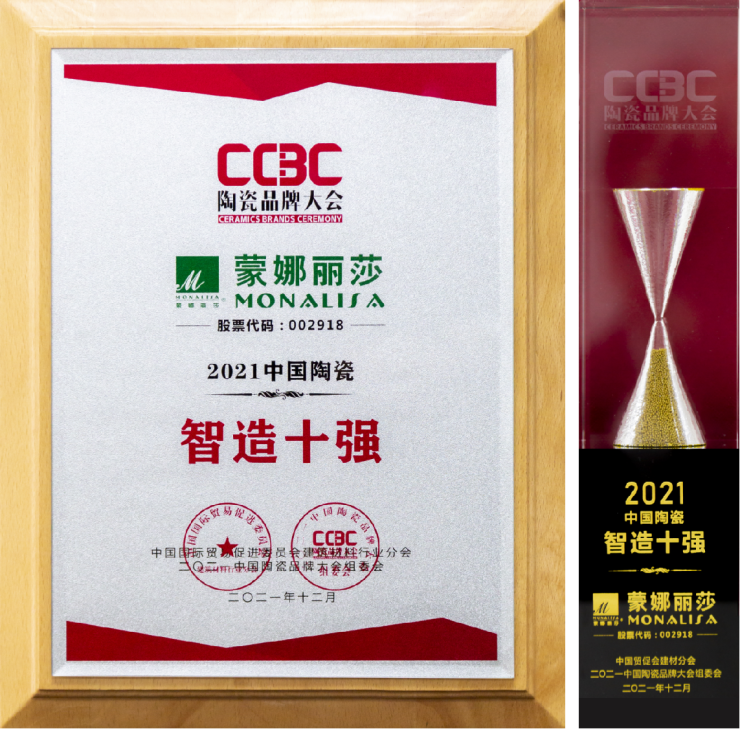 2021年12月10日下午,由中国建筑卫生陶瓷协会、中国贸促会建材分会、《陶瓷信息》报联合主办的“第十一届全国陶瓷人大会暨2021中国陶瓷品牌大会”在佛山华夏明珠大酒店举行,集结行业思潮,共同探讨发展大势,并向本年度建陶行业优秀企业、品牌集中表彰致敬。在“2021中国陶瓷品牌大会”颁奖盛典上,蒙娜丽莎集团荣获“2021中国陶瓷智造十强”,蒙娜丽莎瓷砖荣获“2021中国陶瓷领军品牌”。