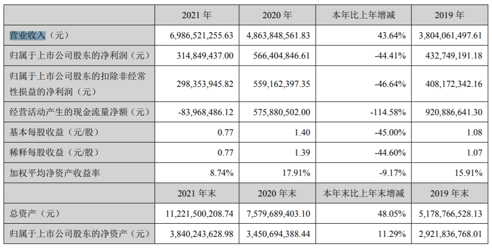报告期内,蒙娜丽莎营业收入69.87亿元,同比增长43.64%,其中陶瓷产品业务的营业收入为人民币68.78亿元,占营业收入总额的98.44%;归属于上市公司股东的净利润3.15亿元,同比下降44.41%。