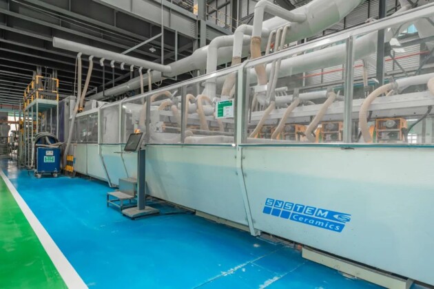 正所谓“砖大一分,难度大三分;砖薄一分,难度大七分”,要生产出满足国标的3mm大规格超薄柔抛岩板需要解决一些技术关。首先,越大的板,缺陷越容易呈现,为了提升产品整体的性能,蒙娜丽莎在3mm超薄岩板砖坯压制上采用进口西斯特姆皮带式方缸顶压成型装备(更大更均匀的压力),结合优异的粉料性能,实现了砖坯更好的均匀性和平整度,减少了致密度和厚度偏差,为后续工序实现提供保障。其次,意大利生产3mm大板的施釉线只有70-80米,而国内一条釉线往往需要实现多种釉面装饰技术及产品规格的转换,一般釉线长度在200米以上。这对于3mm超薄岩板的生产来说,生产难度增加了2-3倍,对于坯体配方强度及生产过程各环节的要求更加严格。尤其是生产1600×3200mm这样的大规格,对整个任何细微的抖动偏差都容易导致产品的破损率增加,只有做到“精准稳”才可以更好地避免因为釉线水平和砖坯强度衰减而导致烂砖情况。再者,传统固定喷头的喷釉设备无法对大规格陶瓷岩板进行全面均匀的喷涂,因此要实现大面积均匀施釉需要采用高压自动摆臂式喷釉柜。蒙娜丽莎的3mm超薄岩板生产线采用的是6轴自动摆臂式高压智能喷釉柜,使得保护釉层布撒更为均匀,解决了超大规格岩板施釉均匀性的问题。