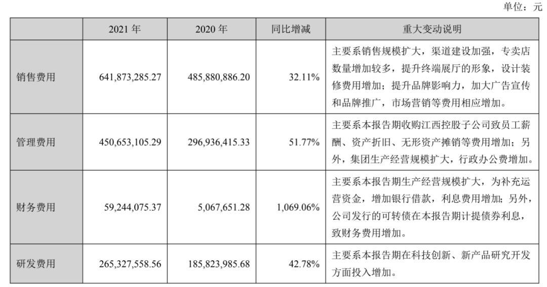 该公司费用的大幅增长,同样引人注目。2021年,蒙娜丽莎营业总成本达到64.16亿元,同比大增52.33%。其中营业成本49.53亿元,同比增长54.97%;销售费用同比增长32.11%;管理费用同比增长51.77%;研发费用增长42.78%。