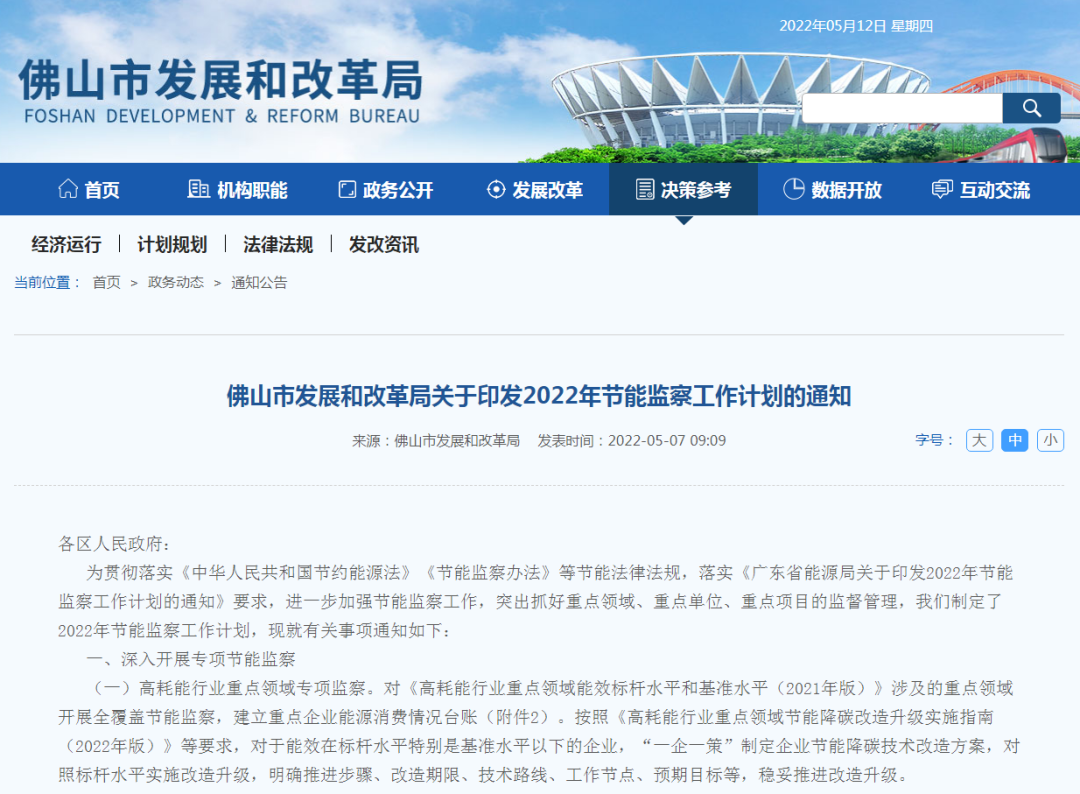日前,广东佛山市发展和改革局印发2022年节能监察工作计划的通知。