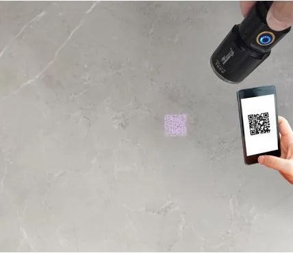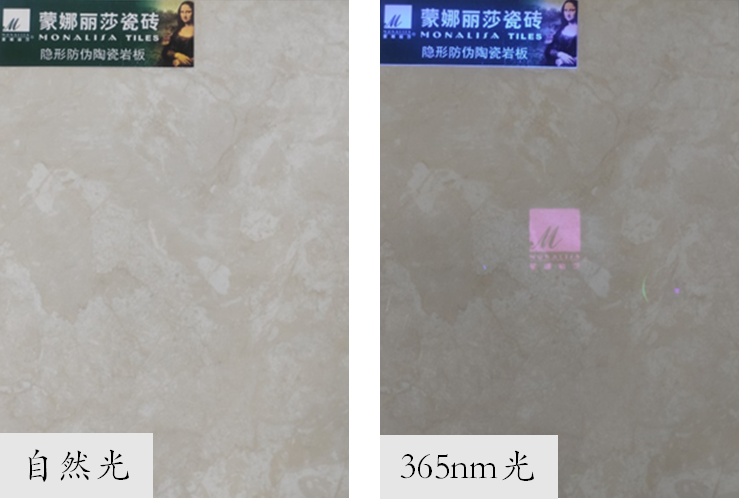“陶瓷岩板烧结法表面隐形防伪技术”首次开发了烧成温度高达1250℃的陶瓷岩板隐形防伪技术。印制的防伪标志隐于陶瓷喷墨装饰图案之下在可见光条件下不可见,在365nm紫光照射下,防伪标志呈现出红色可见的防伪效果,实现了陶瓷岩板表面隐形荧光防伪和二维码双重防伪功能。