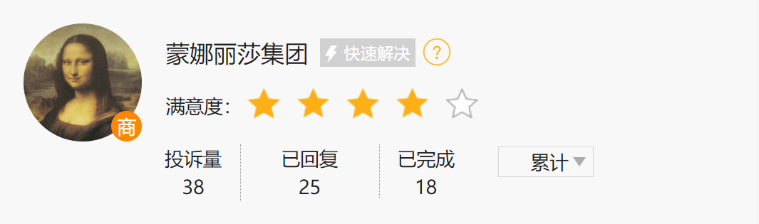 目前,蒙娜丽莎集团在黑猫平台投诉共38起,其中已回复25起,已完成18起。