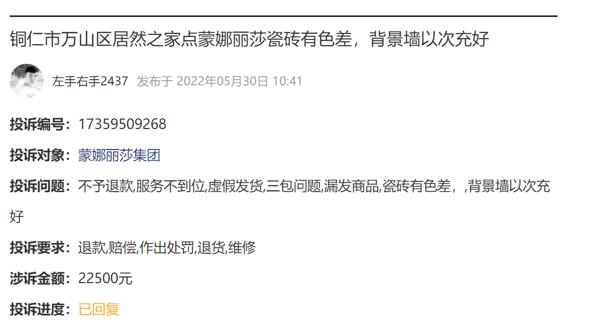 据查,该投诉发布于5月30日,投诉编号为17359509268;投诉问题为瓷砖有色差、背景墙以次充好等;投诉要求为退款,赔偿,作出处罚,退货,维修;涉诉金额为2.25万元。