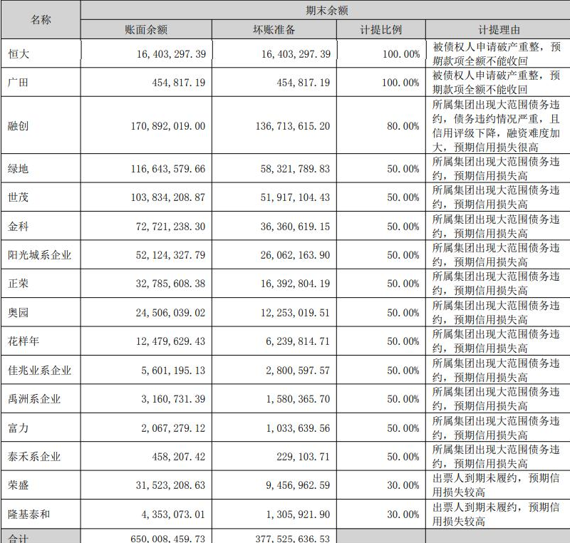 计提理由除了恒大和广田是由于破产,预期款项不能收回外,其他大多数为大范围债务违约。