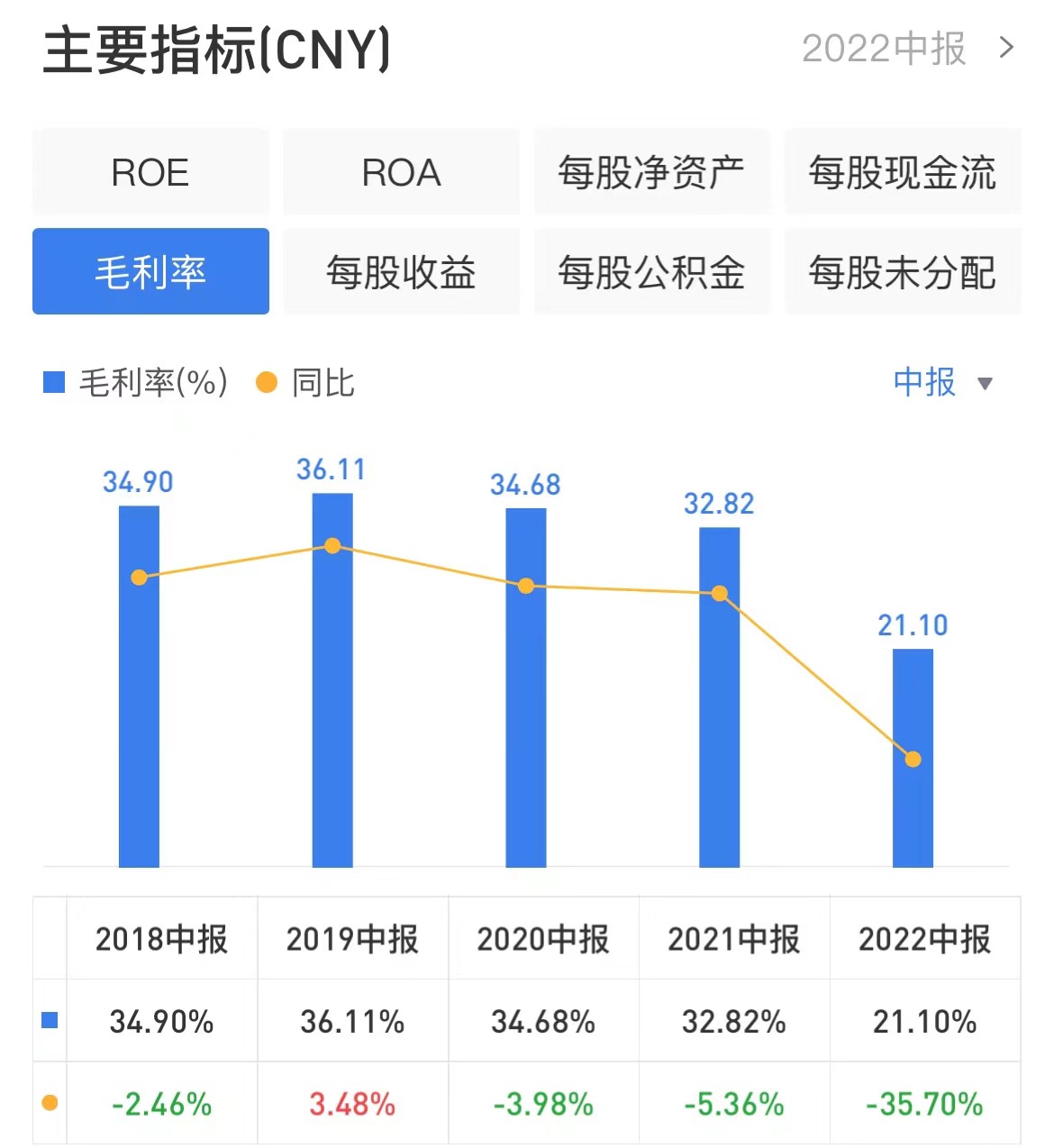 而营业成本和毛利率不无关系。今年上半年,蒙娜丽莎的毛利率为21.10%,同比下降35.70%。这已是蒙娜丽莎毛利率连续三年同比下滑,2020、2021年上半年,蒙娜丽莎的毛利率为34.68%、32.82%,分别同比下降3.98%和5.36%。