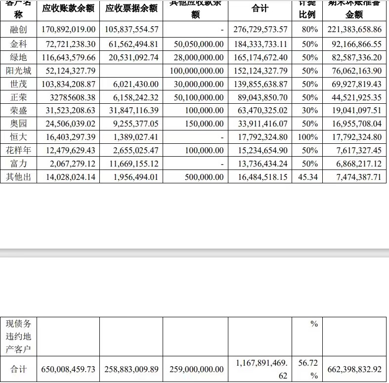 财报显示,在今年上半年,蒙娜丽莎对11家房企计提坏账准备约6.6亿元,计提比例从30%到100%,其中恒大计提比例最高,为100%。