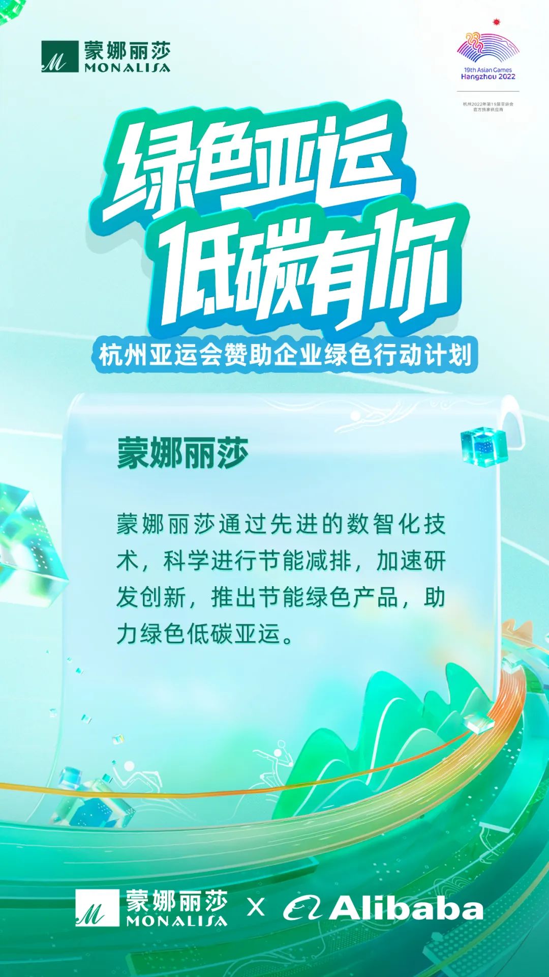 随着杭州亚运会的临近,蒙娜丽莎将与杭州亚运共同发力,用科技点亮绿色,携手共建可持续的绿色亚运,提升全社会绿色减碳意识,共筑美好生活。