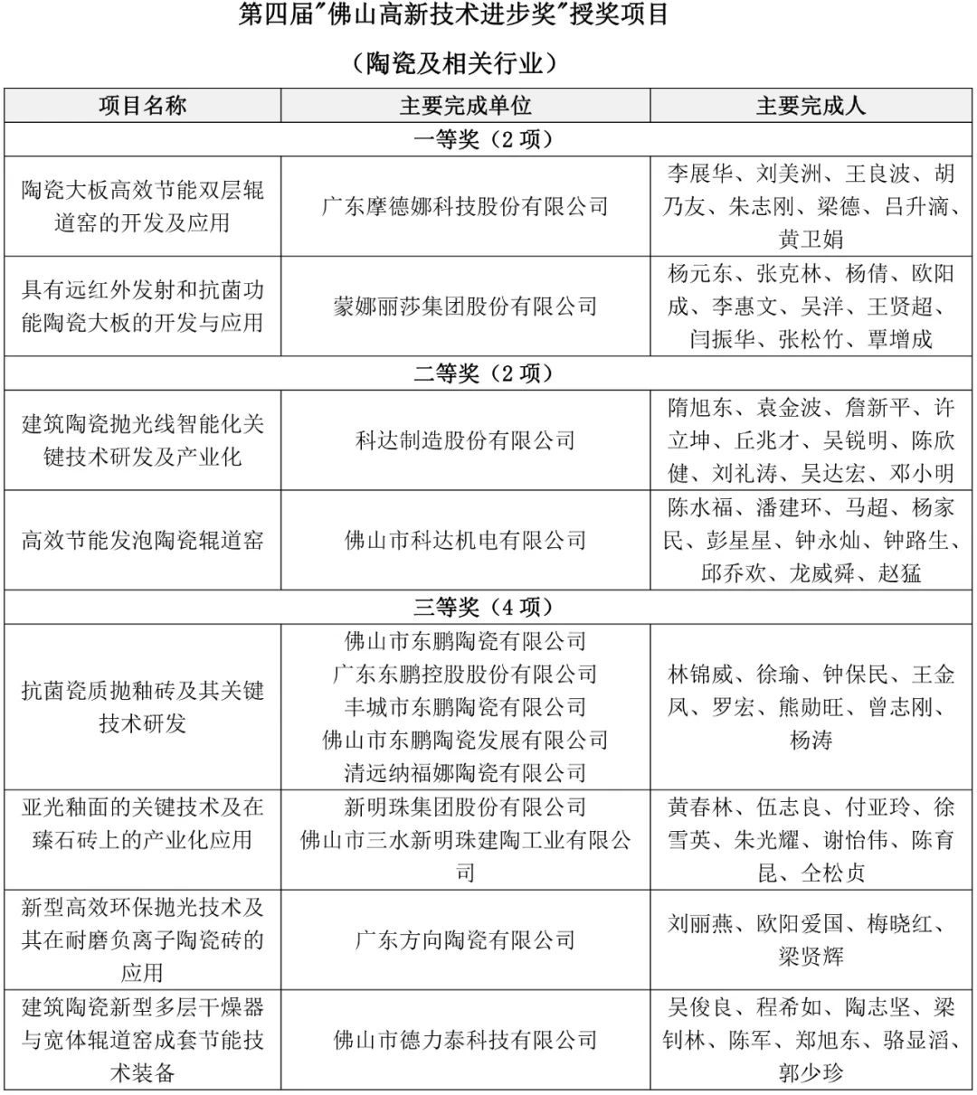 此外,第四届佛山高新技术进步奖一、二、三等奖、佛山高新技术成就奖分别公布。根据授奖名单,陶瓷行业方面有8个项目入围一、二、三等奖,其中,蒙娜丽莎、摩德娜各有1个项目荣获一等奖,科达有2个项目荣获二等奖,东鹏、新明珠、方向、德力泰各有1个项目荣获三等奖。