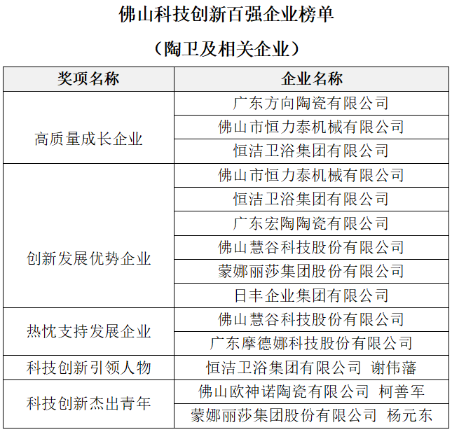近日,佛山市高新技术产业协会“佛山科技创新百强企业榜单”、“第四届佛山高新技术进步奖”表彰大会举行。东鹏、新明珠、蒙娜丽莎、欧神诺、宏陶、方向、科达、恒力泰、德力泰、慧谷等陶卫及相关企业。