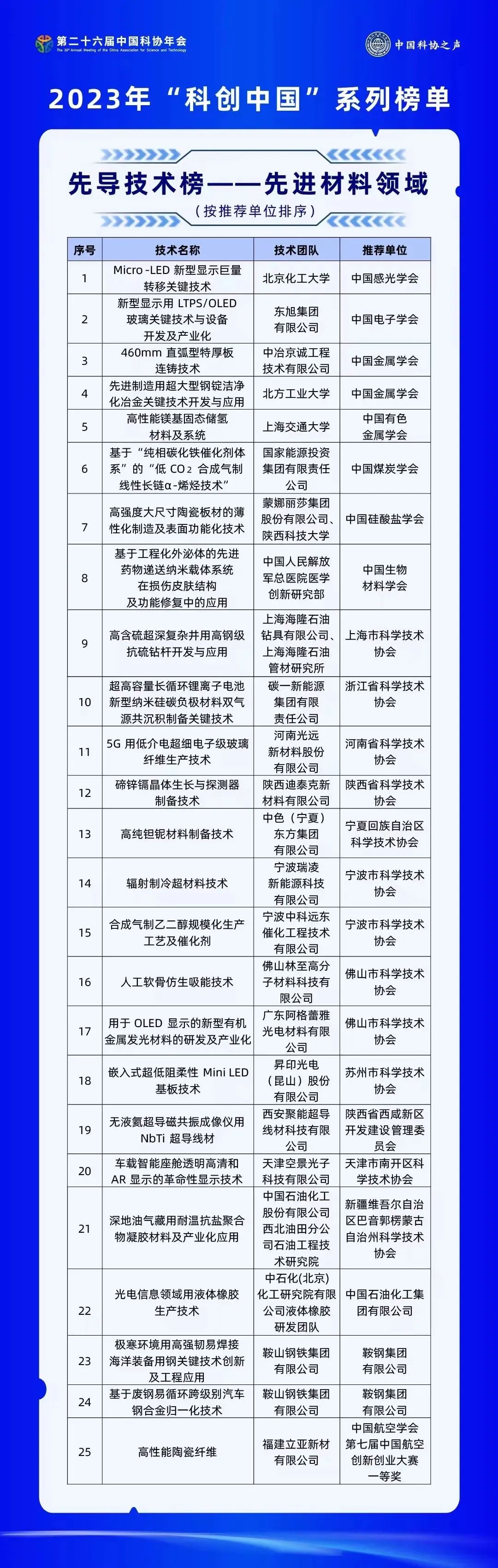 在7月2日召开的第二十六届中国科协年会上,中国科协正式发布2023年“科创中国”系列榜单。榜单发布先导技术榜150项、新锐企业榜50项、融通创新组织榜10项、技术经理人先锋榜20项,共计230项入榜项目。