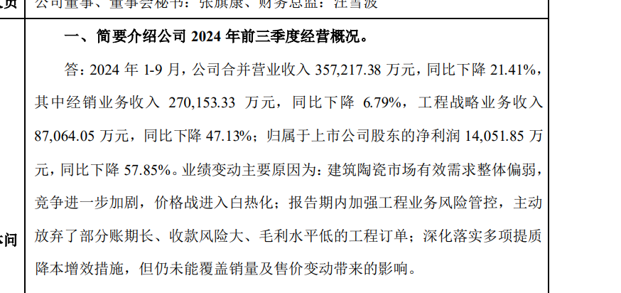2024年前三季度,蒙娜丽莎营收35.72亿元,同比减少21.41%;归属于上市公司股东的净利润1.41亿元,同比减少57.85%。