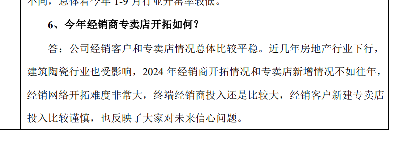 关于今年经销商专卖店开拓情况,蒙娜丽莎表示,公司经销客户和专卖店情况总体比较平稳。近几年房地产行业下行,建筑陶瓷行业也受影响,2024年经销商开拓情况和专卖店新增情况不如往年,经销网络开拓难度非常大,终端经销商投入还是比较大,经销客户新建专卖店投入比较谨慎,也反映了大家对未来信心问题。