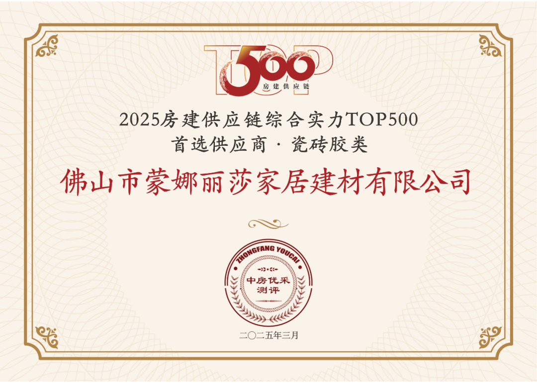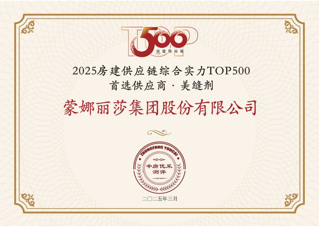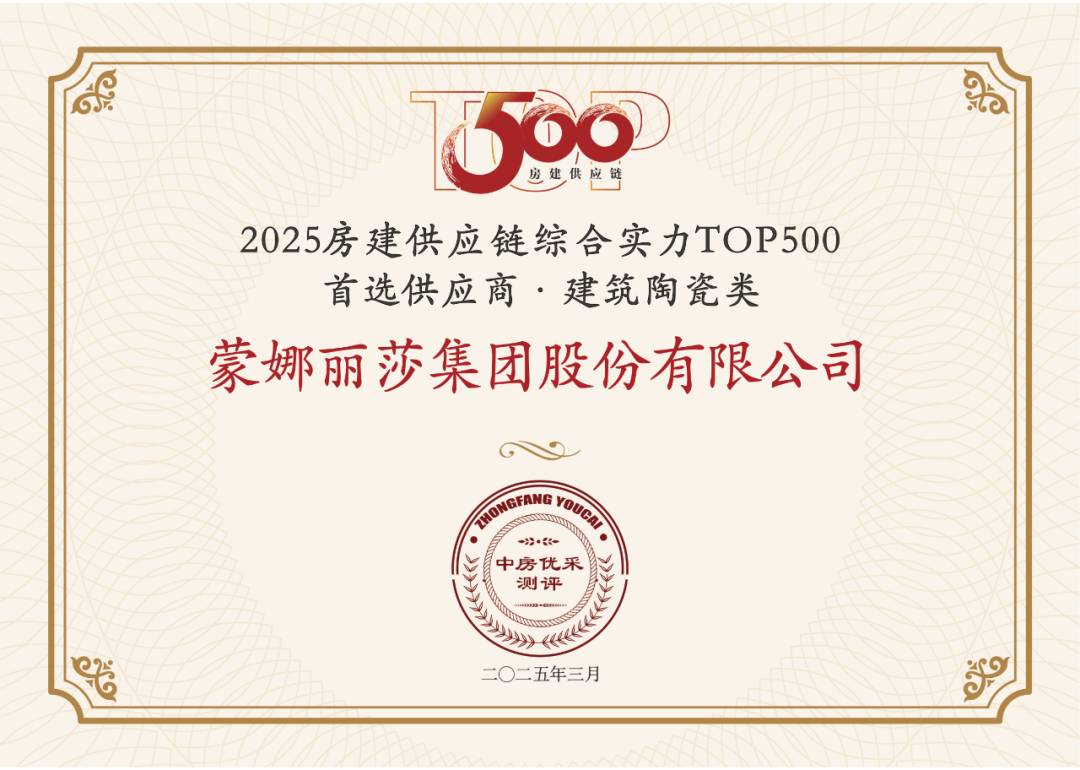 蒙娜丽莎集团股份有限公司凭借领先的综合实力,入选房建供应链企业综合实力TOP500首选供应商,获得建筑陶瓷、岩板、瓷砖胶、美缝剂四大品类实力认证。