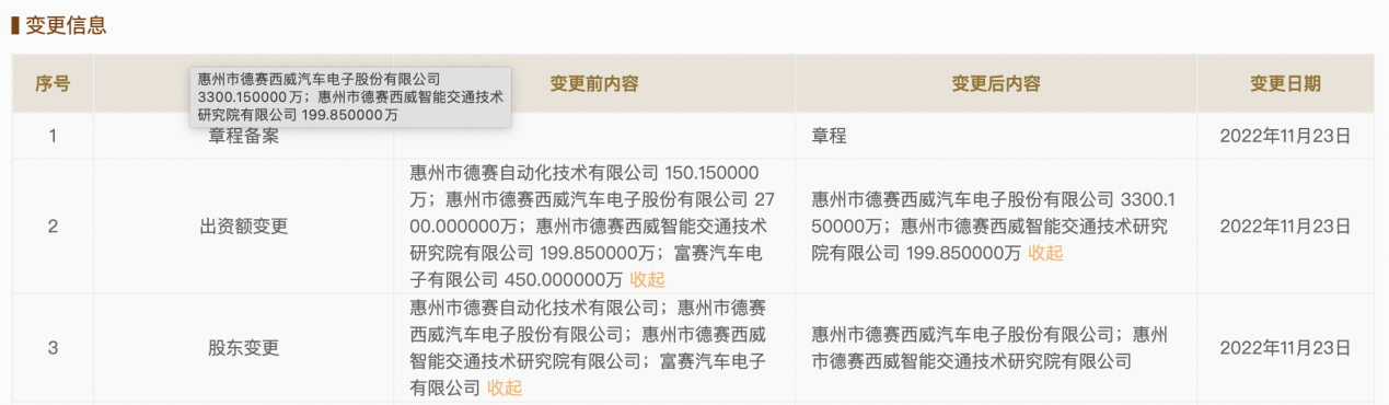 据乐居财经查阅,威汇智能股东变更,德赛西威持股比例从77.14%增加到94.29%,富赛汽车电子有限公司、惠州市德赛自动化技术有限公司分别退出12.86%、4.29%股份。