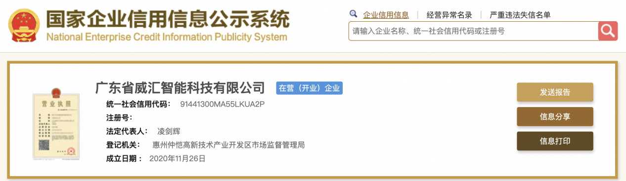 威汇智能成立于2020年11月26日,法定代表人为凌剑辉,注册资本为3500万元,经营范围包含:网络与信息安全软件开发,人工智能应用、人工智能理论与算法软件开发等。