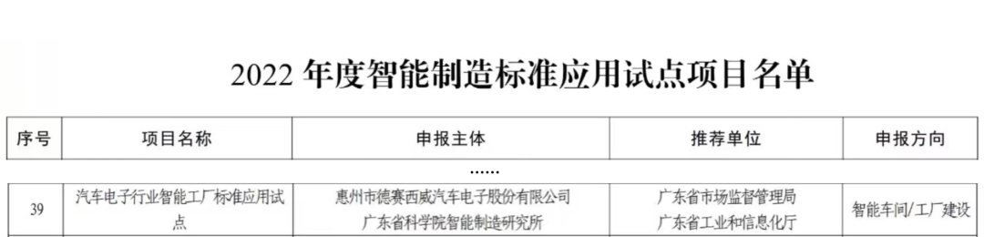 近日,国家标准化管理委员会、工业和信息化部遴选公布“2022年度智能制造标准应用试点项目名单”,德赛西威申报的“汽车电子行业智能工厂标准应用试点项目”成功入围,成为惠州市唯一入选项目。