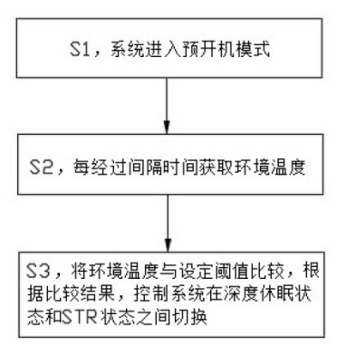 图2为本专利提出的基于STR的节能方法的流程图,首先系统进入预开机模式(S1),预开机模式是系统在开机前的一种模式,在预开机模式中,系统会根据环境参数,决定是否进入STR状态,以兼顾节能和快速开机的需求。然后每经过预设的间隔时间获取环境温度(S2),该步骤中,间隔时间可以是系统默认的时间,也可以是用户自行设定的时间。环境温度可通过现有的温度传感器获取,温度传感器可设置在座舱内/外,通过多个温度传感器综合判断车舱内外的环境温度。