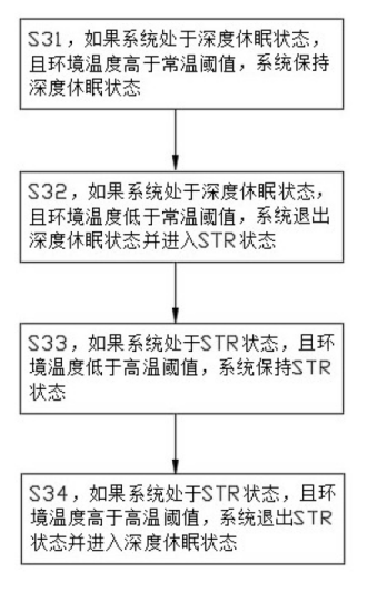 最后将环境温度与设定阈值比较,根据比较结果,控制系统在深度休眠状态和STR状态之间切换(S3)。首先如果系统处于深度休眠状态,且环境温度高于常温阈值,说明当前环境温度下运行STR状态会造成能耗增加,此时系统保持深度休眠状态以节省电量。如果系统处于深度休眠状态,且环境温度低于常温阈值,系统退出深度休眠状态并进入STR状态,以保证系统开机的反应速度。对于第三种情况,如果系统处于STR状态,且环境温度低于高温阈值,说明当前环境温度在运行STR状态时能够维持较合理的能耗,此时系统保持STR状态不变。反之当环境温度高于高温阈值,说明STR状态在当前环境温度下会显著增加系统能耗,此时系统从STR状态切换至深度休眠状态,以保证系统节能。