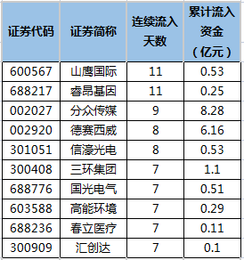 截至6月20日收盘,沪深两市共有53只个股连续5日或5日以上主力资金净流入。连续流入天数最多的是山鹰国际、睿昂基因,均已连续11个交易日净流入;连续净流入天数较多的还有分众传媒、德赛西威、信濠光电、三环集团、国光电气,分别获9个、8个、8个、7个、7个交易日净流入。