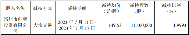 德赛西威控股股东惠州市创新投资有限公司(下称“惠创投”)因自身资金需求,在今年7月11日至17日以大宗交易方式累积减持公司股份1,110万股,占总股本比例的2%,减持均价149.53元/股,合计套现金额16.60亿元。