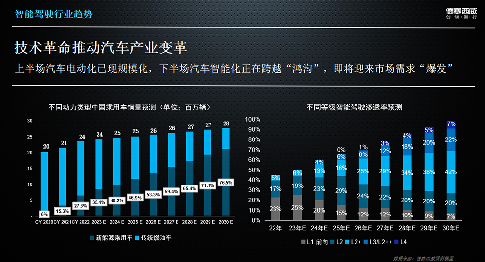 除了我们看到的消费习惯、市场和政策法规的推动,还有技术维度:大算力、芯片的应用,以及大模型的应用,这都会推动高阶智能驾驶的发展。