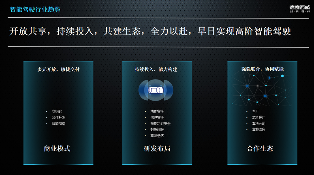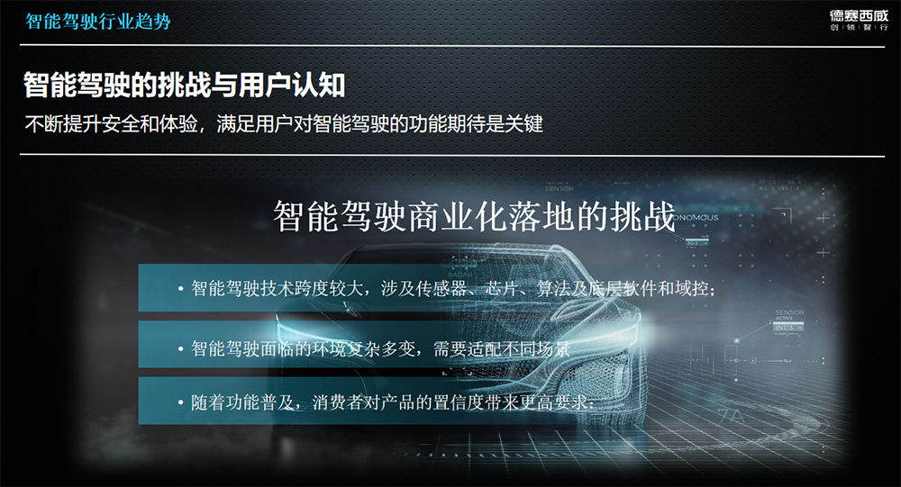 围绕这几个方面,德赛西威怎么解决这几个核心问题?比如说技术跨度大,面对环境复杂的场景驱动下怎么适配不同的场景?随着功能的普及,大家看到功能全上的情况下,怎么让消费者对产品更信任?这也是我们需要思考的问题。