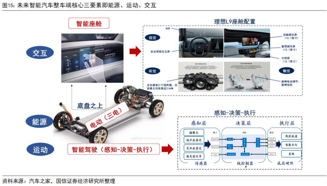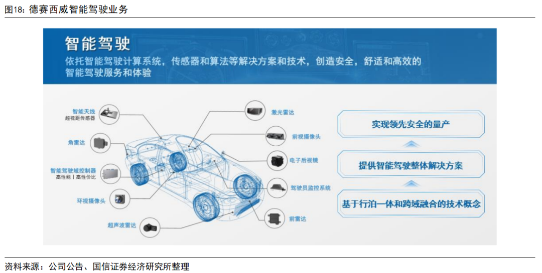 能源-运动-交互,德赛西威为集运动与交互于一体的汽车智能化龙头。展望未来汽车,大致可以分为底盘之上及底盘之下,底盘之上是智能座舱下人机交互的实现场景,细分产业链为“芯片-系统-应用-显示”,屏幕、HUD、玻璃、车灯等均有望成为核心交互产品。底盘之下主要为智能电动和智能驾驶,智能电动集成三电系统,作为整车运动的核心能源支撑;智能驾驶主要是基于“传感器-计算平台-自动驾驶算法”作用到执行层面,实现横向和纵向的运动控制。总结而言,未来智能汽车整车端核心三要素即能源、运动、交互,德赛西威为集运动与交互于一体的汽车智能化龙头。