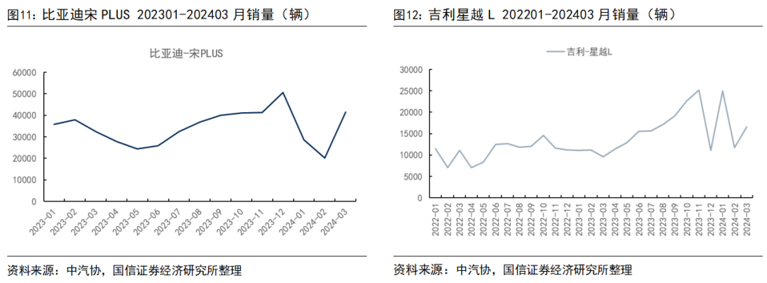 传统车企方面,吉利、比亚迪、丰田的新车型有望在2024年持续贡献重要业绩。我们对吉利、比亚迪部分主流车型进行梳理,自上市以来,比亚迪海豹销量持续攀升,吉利星越L在2024Q1的销量分别为5.3万辆,同比+68%,比亚迪宋PLUS 2024Q1销量为9.05万辆,同比-15%。