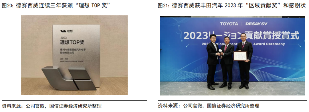 德赛西威坚持以客户为中心,打造以客户为导向的组织管理体系,带动生态开放合作,协同全球客户增长,获得广大客户的认可。在海外,公司作为全球仅有的五家获奖供应商之一,荣获“2023 年度丰田汽车区域贡献奖”。在国内,2023 年公司荣获“理想 TOP 奖”、“奇瑞汽车卓越开发创领奖”、“广汽埃安十佳合作伙伴奖”、“广汽传祺十佳供应商”、“一汽-大众卓越合作伙伴”、“长城汽车真心伙伴奖”、“吉利汽车最佳价值贡献奖”、“上汽通用优秀供应商”、“小鹏汽车与鹏同行奖”、“比亚迪汽车 2023 最佳合作伙伴”、“长安汽车战略生态奖”、“广汽丰田原价优秀奖”、“广汽丰田品质共进奖”。2024年3月22日,丰田汽车采购管理部一行来到德赛西威惠南园区,为德赛西威颁发了2023年“区域贡献奖”和感谢状,该奖项是丰田汽车最高荣誉之一,本年度仅五家供应商获此殊荣,多项重磅荣誉是丰田汽车对德赛西威不懈投入的高度认可,也是双方合作坚如磐石的重要象征。