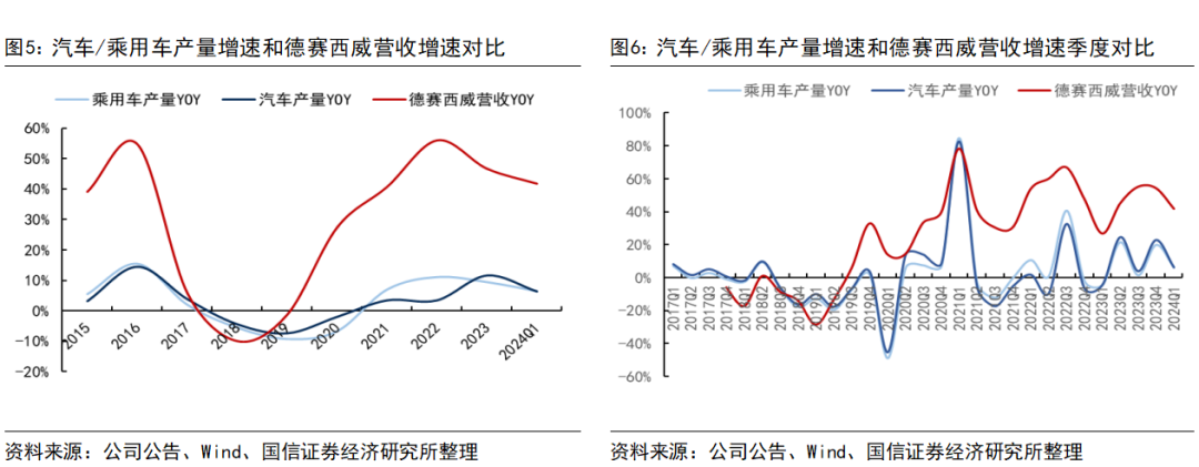 一方面,存量端,公司重要客户理想汽车、吉利汽车、奇瑞汽车、一汽大众、上汽大众、一汽丰田、广汽丰田在2024Q1的销量同比分别+53%、+48%、+66%、+5%、+10%、-12%、-29%;另一方面增量车型和增量产品贡献了2024Q1重要的业绩增长,增量车型或来自于理想、吉利、广汽等。