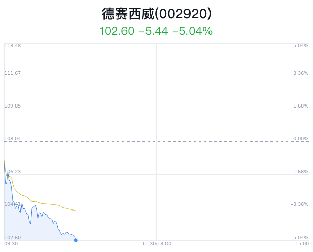 05月21日,德赛西威(002920)股价大幅下跌,截至10点26分,德赛西威下跌5.04%,报102.60元/股,创近2月新低,成交4.29亿元,换手率0.75%,振幅4.08%。