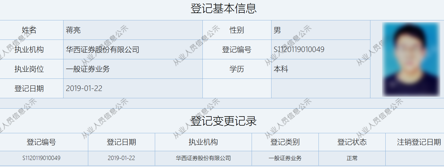 中证协从业人员信息公示显示,姓名为“蒋亮”且在券商从业人员仅有一人,蒋亮2019年1月22日在在华西证券股份有限公司(002926.SZ)登记执业,登记类别为一般证券业务,登记状态现为正常。