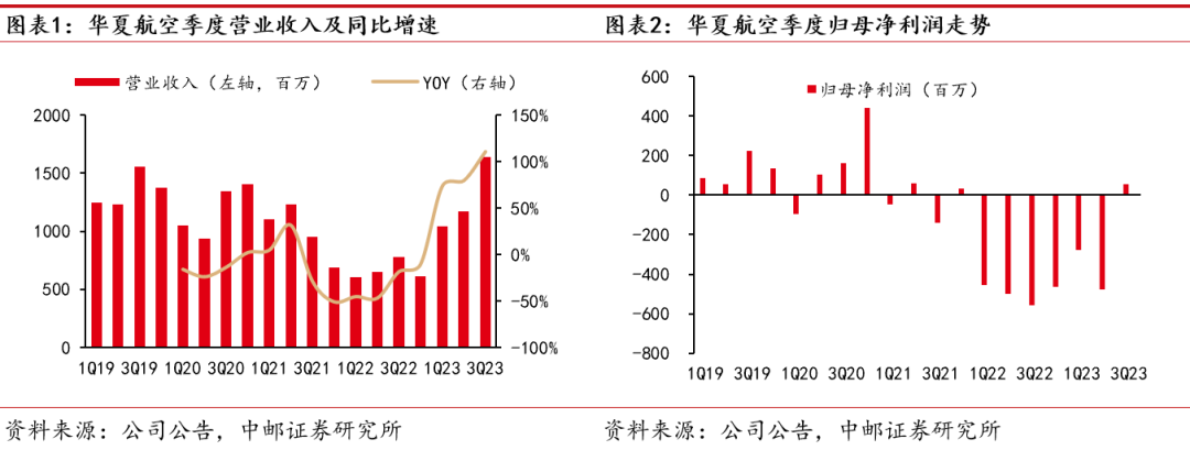 华夏航空披露2023年三季报,1-3季度实现营业收入38.5亿,同比增长90.0%,其中第三季度营业收入16.4亿,同比增长110.9%。1-3季度实现归母净利润-6.97亿,同比大幅减亏,其中第三季度实现归母净利润0.55亿,实现扭亏为盈。