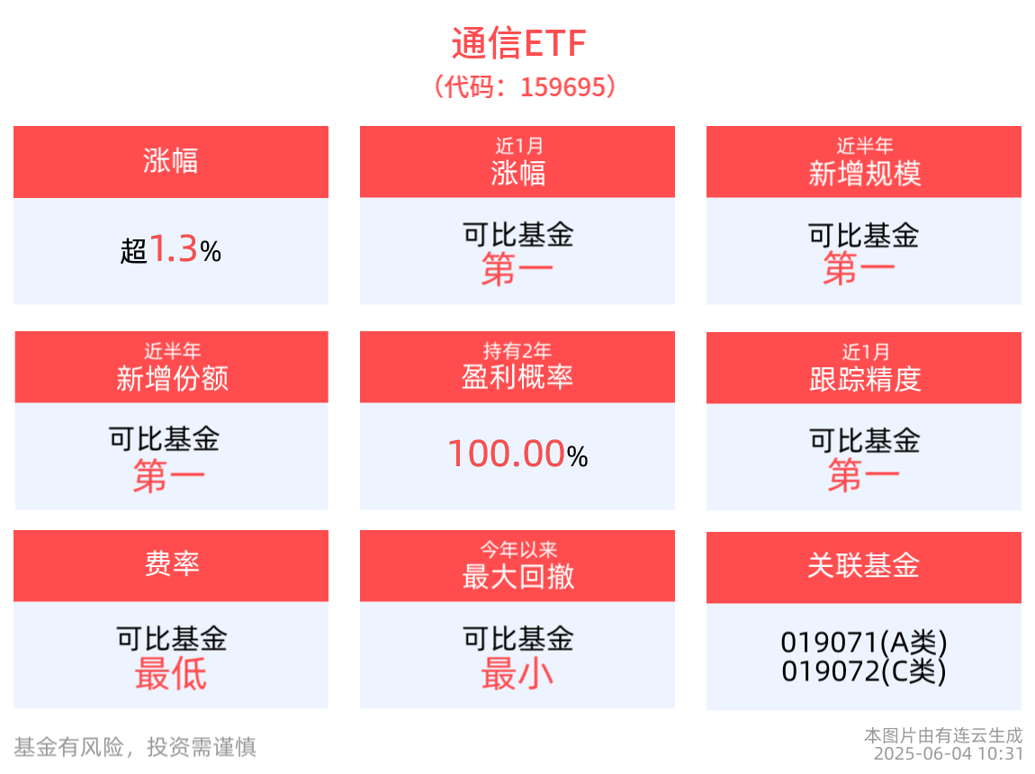 流动性方面,通信ETF盘中换手1.89%,成交190.86万元。拉长时间看,截至6月3日,通信ETF近1年日均成交893.34万元。