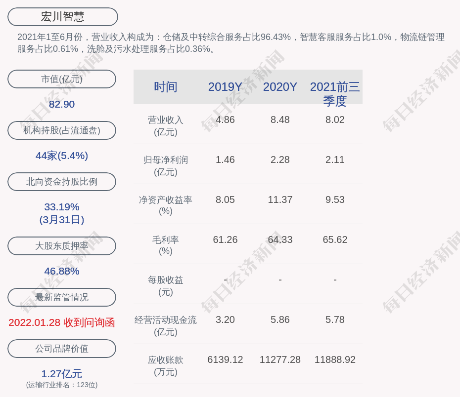 2021年1至6月份,宏川智慧的营业收入构成为:仓储及中转综合服务占比96.43%,智慧客服服务占比1.0%,物流链管理服务占比0.61%,洗舱及污水处理服务占比0.36%。
