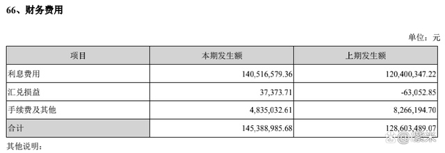 年报显示,公司财务费用为1.45亿元。去年同期为1.29亿元。其中,利息支出为1.41亿元,汇兑损失3.74万元。