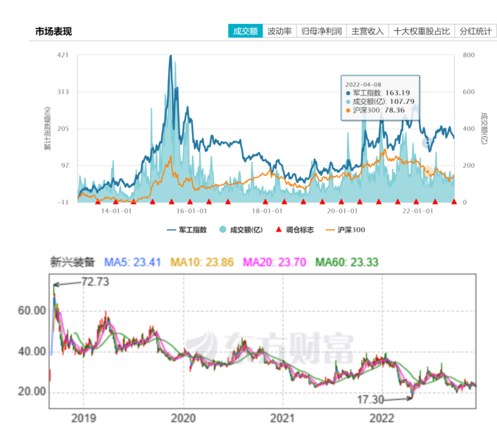 而从二级市场来看,军工指数(399959.SZ)基本接近近3年低点,也推动新兴装备的股价行至相对低位(23元左右),市值仅为27亿元上下。