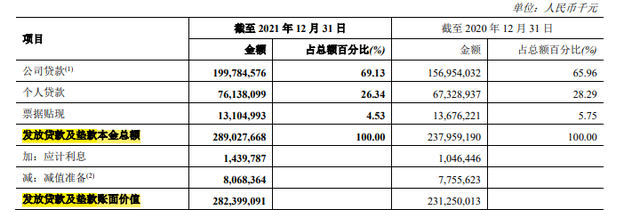 截至去年末,郑州银行发放贷款及垫款本金总额2890.28亿元,较2020年末增加了510.68亿元,增幅21.46%;相应的减值准备为80.68亿元,增幅4.03%;发放贷款及垫款账面价值为2823.99亿元,增幅22.12%,在总资产中的占比由2020年末的42.21%升至49.11%,上涨了6.9个百分点。