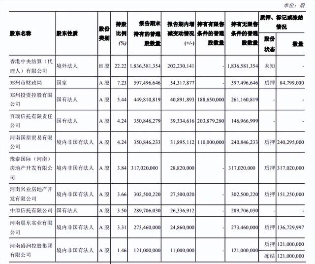具体来看,郑州银行第二大股东郑州市财政局质押了0.85亿股;并列第四大股东的河南国原贸易有限公司质押了2.40亿股;第六大股东豫泰国际(河南)房地产开发有限公司将所持的3.17亿股悉数质押;第七大股东河南兴业房地产开发有限公司质押了1.51亿股;第九大股东河南晨东实业有限公司质押了1.37亿股;第十大股东河南盛润控股集团有限公司所持股权,已被全盘质押和冻结。