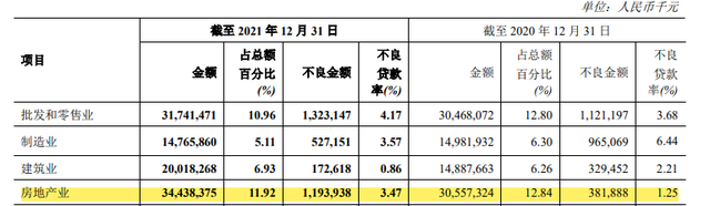 此外,房地产业贷款金额占比较2020年下降0.92个百分点至11.92%,但不良贷款率却由1.25%升至3.47%,上涨2.22个百分点;不良贷款余额11.94亿元,较年初的3.82亿元暴增212.64%。