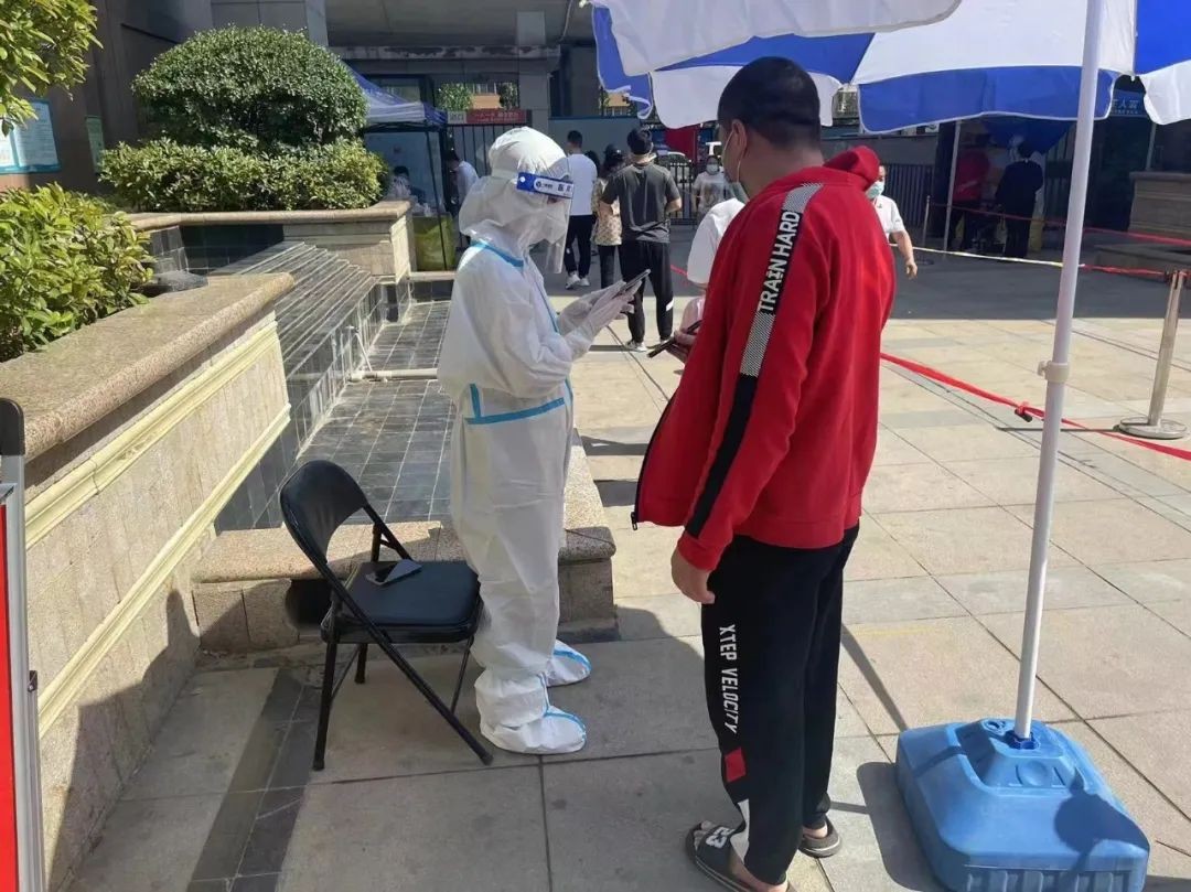 信阳分行第一党支部王言积极参与社区核酸检测服务。