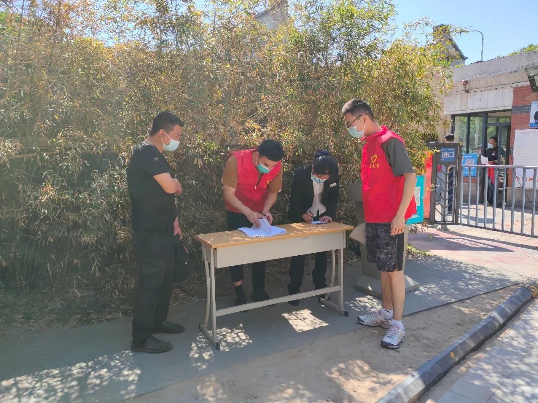 郑州管理部第五党支部田伟伟协助物业工作人员检查登记小区居民临时出入时间,引导居民做好核酸检测工作。