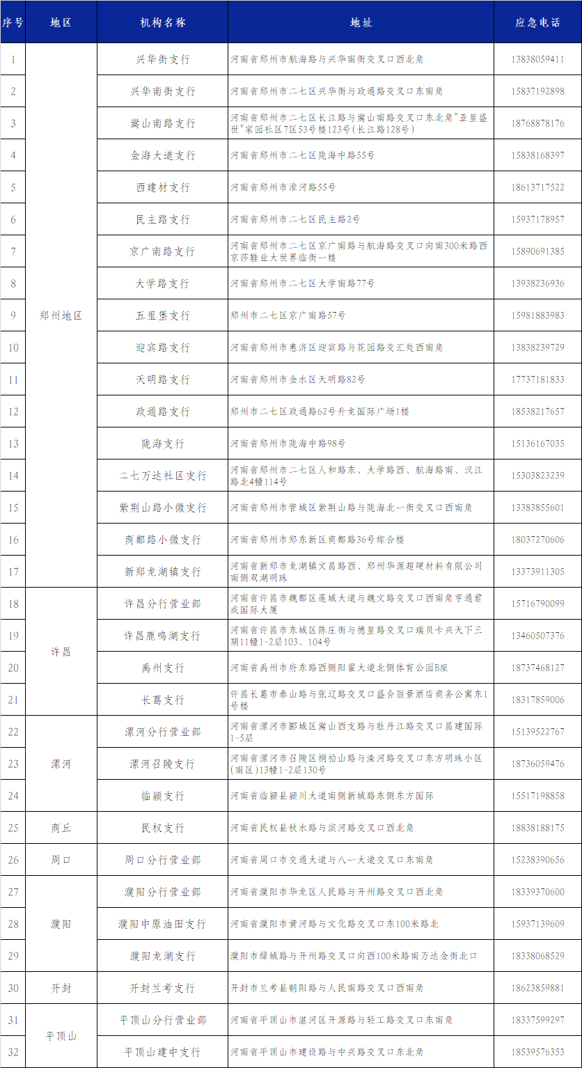 根据郑州市和各地市新冠肺炎疫情防控要求,截至2022年5月12日,郑州银行省内32家营业网点因在封控、管控区,暂时停业,恢复营业时间根据当地疫情防控指挥部通知执行,其他网点正常营业。