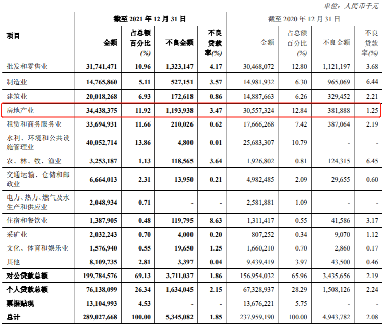 截至报告期末,郑州银行不良贷款率为1.85%,较2020年年末下降0.23个百分点。按行业划分,截至报告期末,郑州银行贷款的不良贷款主要集中在批发和零售业、房地产业以及制造业。其中,房地产业贷款金额为344.38亿元,占总额11.92%;房地产业不良贷款金额为11.94亿元,不良贷款率为3.47%,较上年期末有所上升。