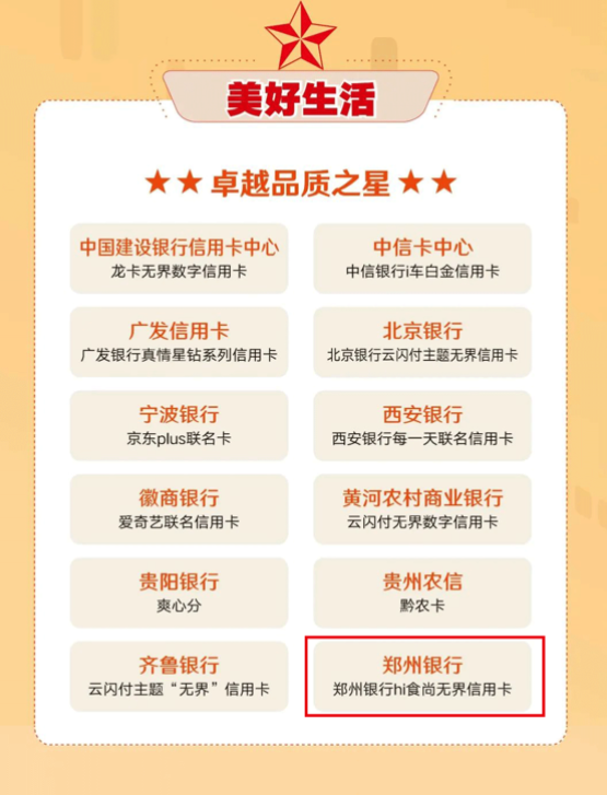 近日,由金融数字化发展联盟主办,银联数据、《银数观卡》、《中国信用卡》联合承办的2022年“卓越信用卡”评选活动获奖榜单揭晓,郑州银行hi食尚无界信用卡、奥电影联名信用卡分获2022年“美好生活奖·卓越品质之星”和“卓越人气奖·人气之星”两项大奖。