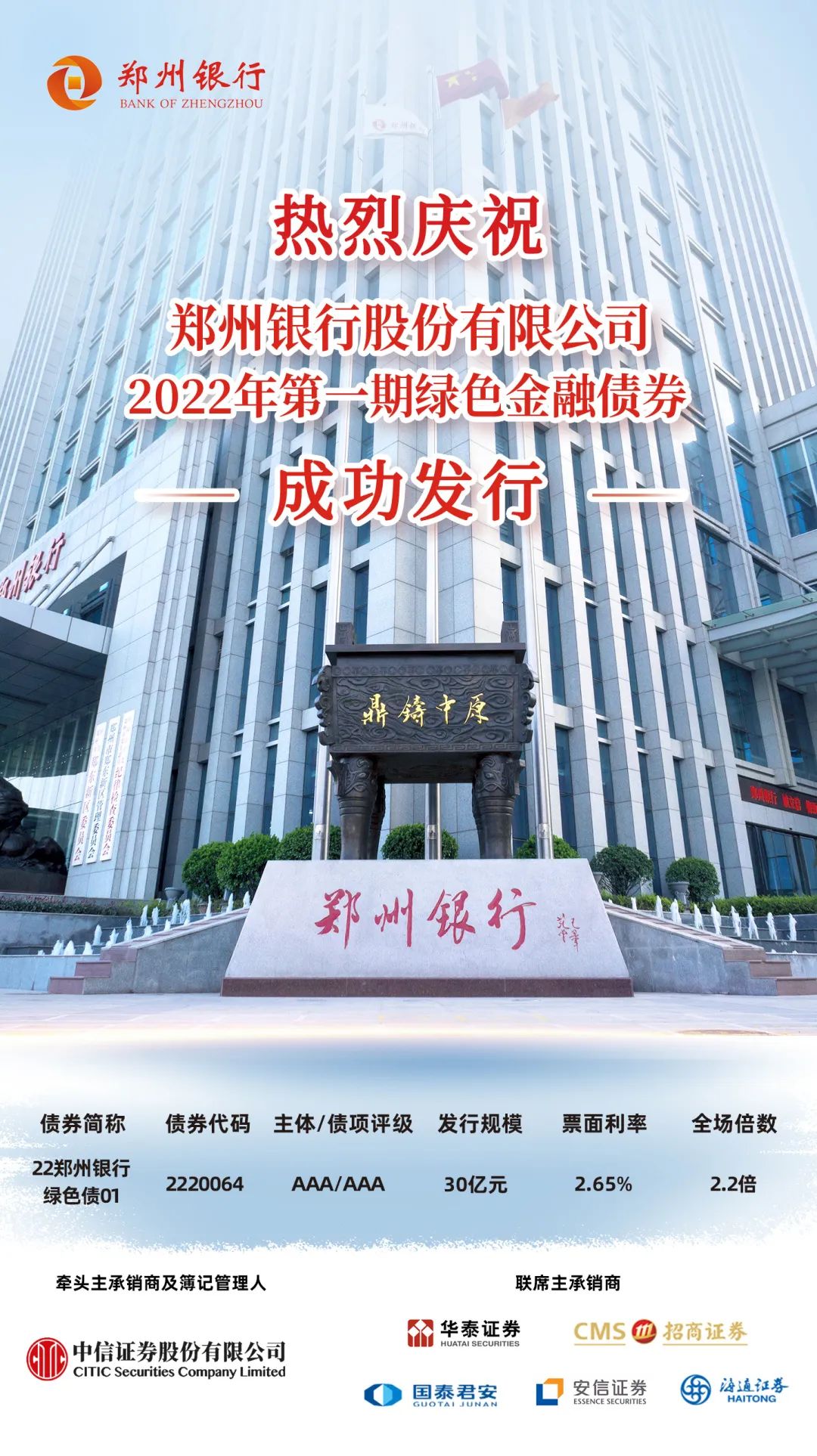 9月15日,中国外汇交易中心支持郑州银行通过交易中心发行系统成功发行3年期绿色金融债券,发行规模30亿元,期限为3年,发行利率2.65%,主体和债项评级均为AAA。本期债券募集资金将全部用于《绿色债券支持项目目录(2021年版)》规定的绿色项目,对于进一步拓宽绿色项目融资渠道,加大对绿色信贷的支持力度,推动绿色信贷业务稳健、健康发展具有重要意义。