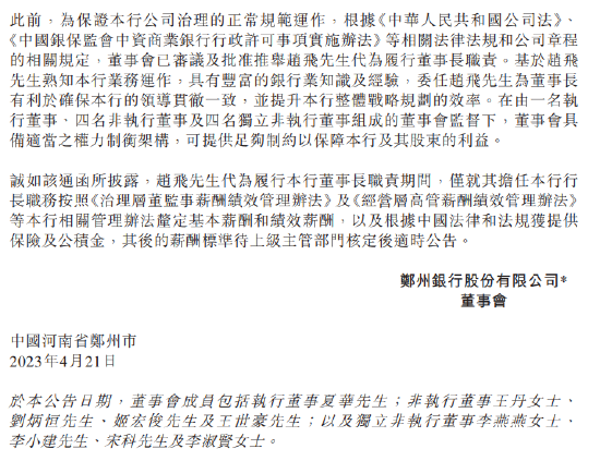 4月21日消息,郑州银行今日晚间发布公告称,董事会同意选举赵飞为该行第七届董事会董事长,其任职资格尚须报请监管部门核准,任期自监管部门核准其董事长资格之日起至第七届董事会任期届满之日止。在此之前,赵飞仍然代为履行该行董事长职责。