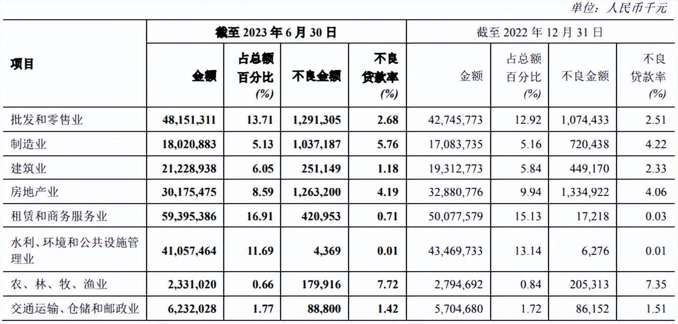 在郑州银行的贷款业务中,公司贷款占贷款总额的70.72%,主要投向的前五大行业分别是租赁和商务服务业、批发和零售业、水利环境和公共设施管理业、房地产业和建筑业,截至2023年6月末,上述五大行业贷款分别占贷款总额的16.91%、13.71%、11.69%、8.59%和6.05%,合计占比56.95%。其中,郑州银行房地产业贷款的不良率整体较高,不良率为4.19%,较上年末上升0.13个百分点。