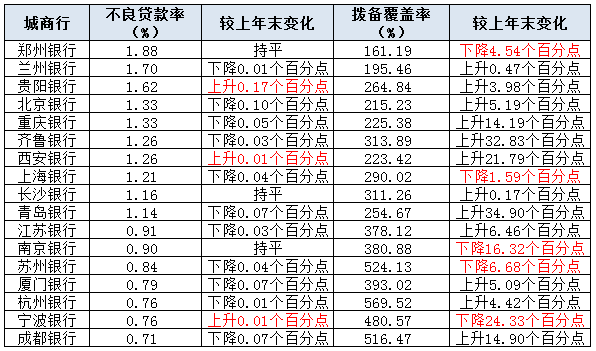 另外,郑州银行、长沙银行、南京银行不良贷款率与上年底持平;贵阳银行、宁波银行、西安银行不良率较上年底有所抬升。